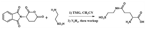 An improved synthesis of γ-L-glutamyl-taurine (Glutaurine) similarly involves the direct reaction of NPGLA (Figure 8) with taurine solubilized in acetonitrile with tetramethyl guanidine. Deprotection using hydrazine in the same pot afforded the dipeptide (Figure 10). In the synthesis of γ-glutamylmarasmine, NPGLA has been used effectively (12). An enantioselective synthesis of chloroquine and the establishment of configuration used NPGLA as a pivotal chiral agent (13).