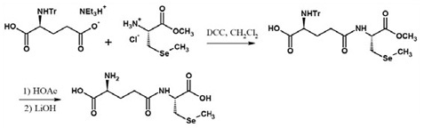 γ-Glutamyl group can be incorporated onto a typical amino acids in a several ways. Basically this usually requires the protection of two of the three carboxylic groups in the reactant molecules as esters (leaving of course the third γ-COOH of the glutamic acid free). Also the amino group of the L-glutamic acid residue should be suitably protected. Figure 7 shows a sequence wherein only two protecting groups are used. The trityl group on the glutamic acid functions plays a dual role wherein it protects the amino group as well as rendering the neighboring -COOH as sterically unreactive. The carboxyl of the other component, namely, Se-methyl-L-selenocysteine is protected as a methyl ester. After the formation of pseudopeptide bond, the two protecting groups need to be removed sequentially without affecting the amide linkage (10).